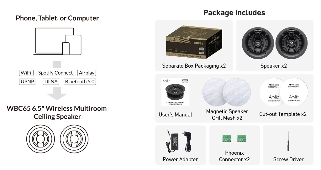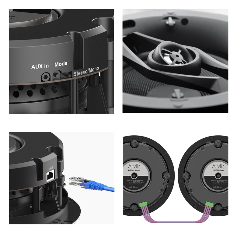 Multiroom Audio System: Mix and match any combination of Arylic Streamers and WBC65 wireless ceiling speakers to create a custom whole house audio system. Play the same music throughout your home, send different tunes to each room simultaneously, or create your own custom-defined multiroom zones. All these features are controlled via our 4stream App, making it easy to manage your wireless ceiling speakers from anywhere.