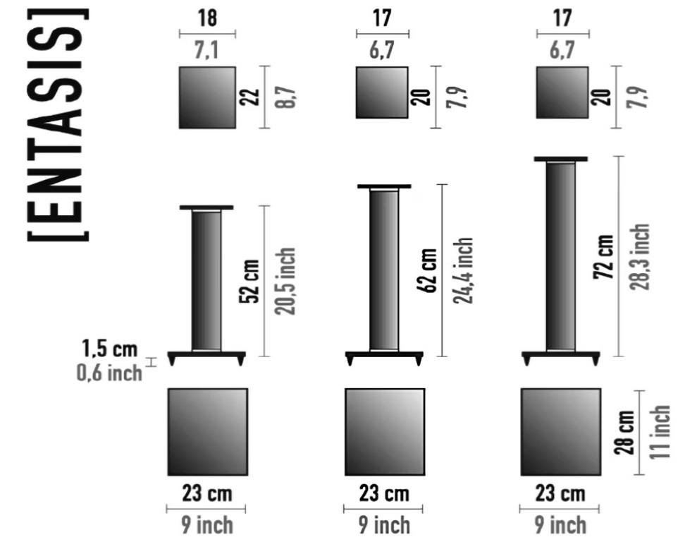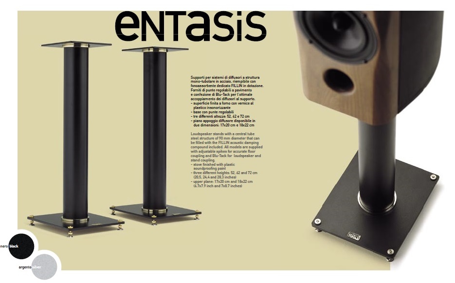 Music Tools Entasis is a line of specific supports for those loudspeakers designed and optimised for raised listening on dedicated pedestals. The mono-tubular steel structure is filled and tuned with a special sound-absorbing material «FILLIN» (included) which drastically reduces vibrations, significantly increasing the stability of the stands. They are handcrafted in Italy with high quality materials to offer superior sound performance.