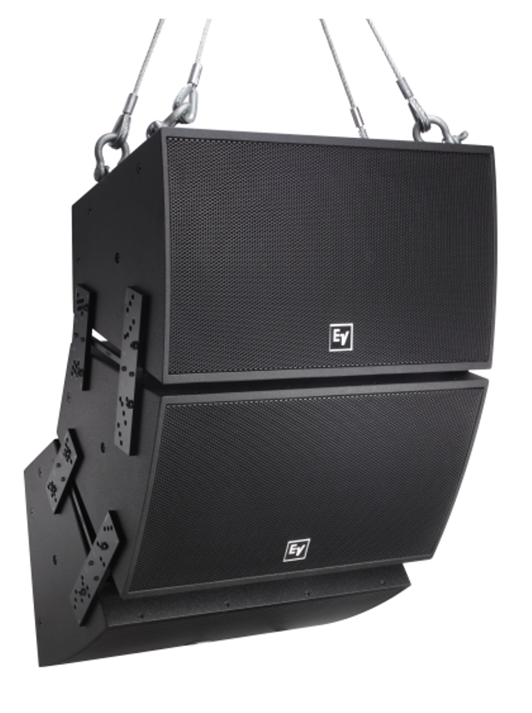 EVF two‑way full‑range systems are offered in seven coverage patterns that provide solutions for the widest possible range of installation challenges. The 12″ Constant Directivity waveguides can be rotated to work with a vertical or horizontal orientation. Biamp operation is supported, but the sophisticated fourth‑order crossover and protection network makes cost‑saving, passive operation extremely attractive. Using optional rigging accessories, you can create attractive clusters that include EVF full‑range systems, as well as EVF subwoofers or EVH full‑range systems. Cabinets are available in three finishes: EVCoat (interior use), PI (indirect weather exposure) or FG (fiberglass—for direct weather exposure); they include twenty‑two M10 threaded suspension points.