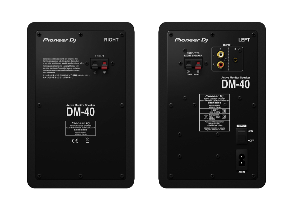What’s in the box: DM-40 x 2, Power cord, 2 m speaker cable (for left/right channel connection), Audio converter cable (3.5 mm stereo mini plug to RCA), Bottom cushion x 8, Operating instructions.